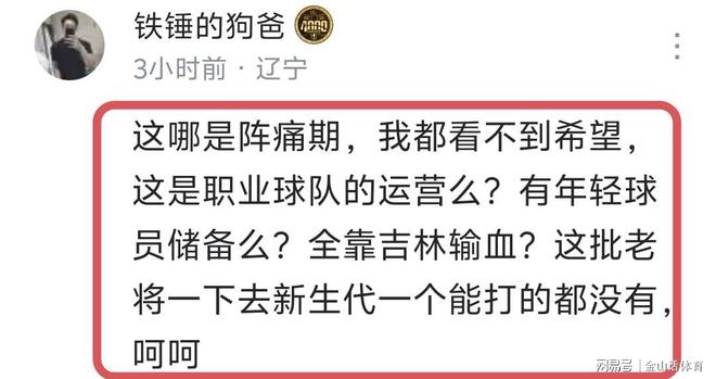 俱樂部杯賽早早出局,也令許多遼迷也感到非常失望,“吃完老本了……不知道你的命運如何?。窟@個賽季,楊導(dǎo)!”;“感覺至少5年內(nèi)遼寧是沒希望了”;“他就是cba的泰倫盧”;“你現(xiàn)在的首要任務(wù)是下去給烏戈當助理”;“還扯蛋呢,繼續(xù)洗,睜著眼說瞎話”;“這哪是陣痛期,我都看不到希望,這是職業(yè)球隊的運營么?有年輕球員儲備么?全靠吉林輸血?這批老將一下去新生代一個能打的都沒有,呵呵”……
