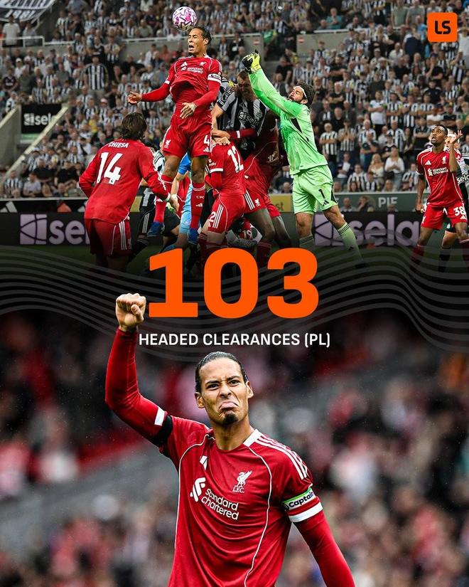 定海神針,范戴克是本賽季五大聯(lián)賽唯一頭球解圍破百次的球員